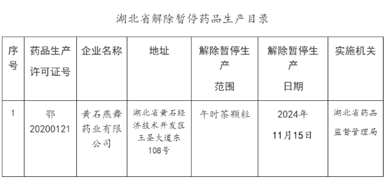 黄石燕舞药业有限公司现提出解除风险控制措施的申请。经对黄石燕舞药业有限公司的午时茶颗粒生产进行药品GMP符合性检查,综合评定为符合要求。根据《药品生产监督管理办法》和《药品检查管理办法(试行)》的相关规定,湖北省药品监督管理局决定从2024年11月15日起解除黄石燕舞药业有限公司暂停午时茶颗粒生产的风险控制措施。