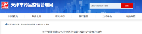 日前,天津市药品监督管理局发布关于暂停天津未名生物医药有限公司生产销售的公告。