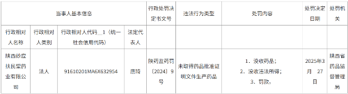 2025年3月27日,依据《药品管理法》第一百二十四条第一款第一项,《行政处罚法》第三十二条第一款第一项之规定,陕西省药品监督管理局给予企业以下处罚:
