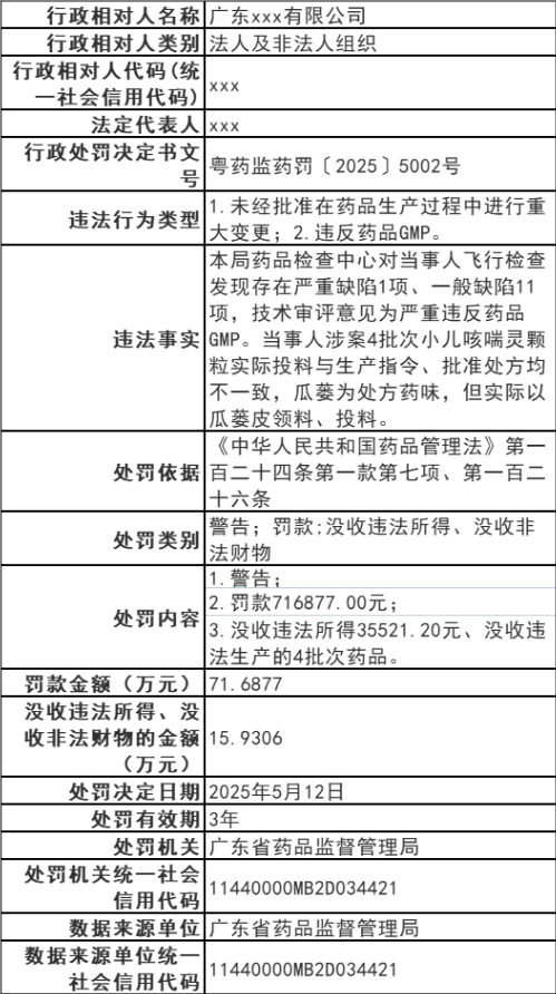 行政处罚决定书(粤药监药罚〔2025〕5002号)显示,广东省药品监督管理局药品检查中心对广东xxx有限公司飞行检查发现存在严重缺陷1项、一般缺陷11项,技术审评意见为严重违反药品GMP。