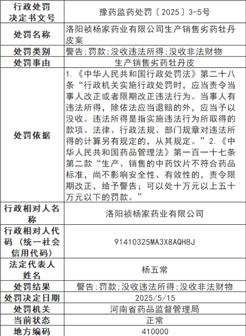 行政处罚决定书(豫药监药处罚〔2025〕3-5号)显示,洛阳祯杨家药业有限公司生产销售劣药牡丹皮。